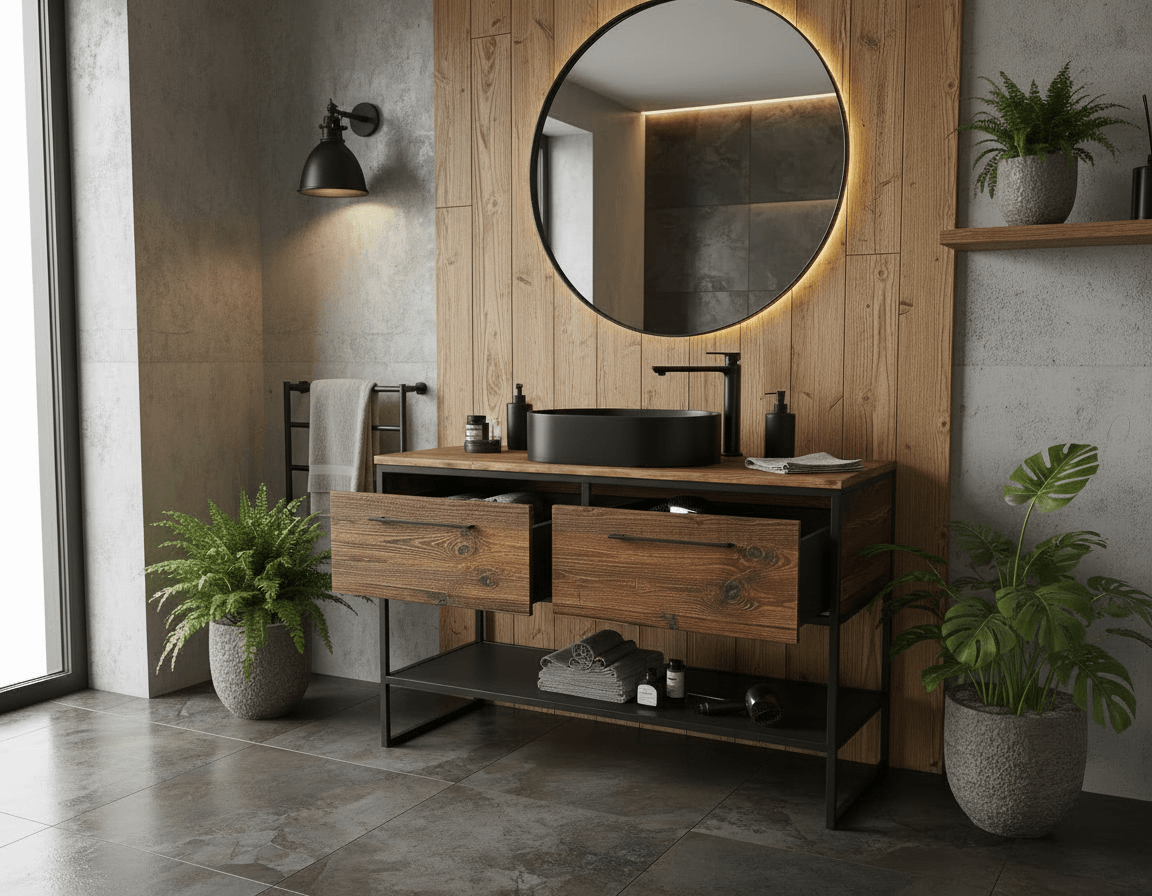 Postaw na autentyczność i ekologię. Nasza podwieszana szafka łazienkowa to unikatowe połączenie naturalnego drewna z odzysku oraz surowego, industrialnego stylu. Każdy egzemplarz opowiada własną historię, zachowując niepowtarzalną strukturę i rysunek słoojów, których nie znajdziesz w masowej produkcji.