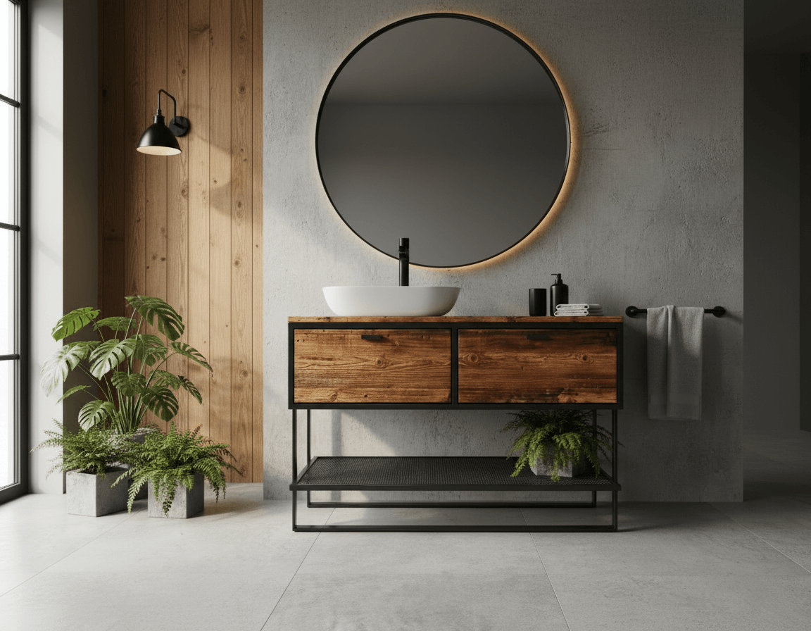 Loftowa szafka łazienkowa OM39 z odzyskanego drewna i metalu łączy surowy styl z funkcjonalnością. Wyposażona w dwie szuflady i metalową półkę, oferuje praktyczne przechowywanie oraz unikalny, industrialny charakter.